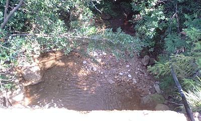 13時にA-cityのセブンに集合し、そこから北の方へ走ること15分ぐらい。バイクをとめ、何やら土石流の後か?と思しき広大な荒地を徒歩で横切ること100mほど。数mの落差の下、小川がありました。