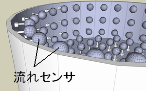 図1のように、洗面器状の容器に水を張り、側壁・底面にたくさんの「流れセンサ」を設置。流れセンサは、流速受容体(ただのボール)とリンク、2軸角度センサからなるモジュール。水流に沿って動くジョイスティックのようなものだと思ってもらえればよい。水をかき混ぜるとn個の流れセンサからそれぞれ2次元の流れベクトル値が出てきて、膨大な入力ベクトル空間が形成される。