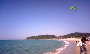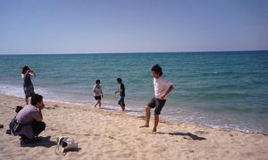 とはいえ海水浴場ではないので、波打ち際でぱちゃぱちゃ。調子に乗って服を濡らす者(私)、砂上の楼閣を築く者、海岸に落ちているものを拾っては投げつけてくる者(リーダー、今年23)。