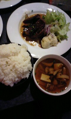 というわけでこの日もカレー。昼はカレー。たまごとルーが絶妙に混ざったたまごカリー!(図1) そして夜はななな何とステーキ定食! レアステーキとナス・マッシュポテト等の付け合わせ、サラダ、そして松茸スープ!!(図2) なんじゃこの豪華さはぁぁぁぁぁあ!!わしらの日当でも払い切れんのちゃうか!!! どう見ても採算度外視です。本当にありがとうございました。