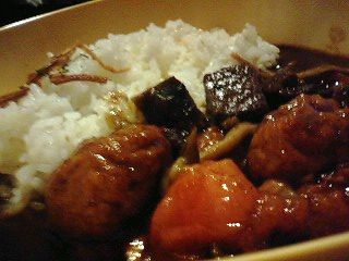 さて。今日のカリーは鶏のヤゲン軟骨と何かパイナップルとかバナナっぽいのも入ってなぁ~それらプラス、ビーフ・茄子・じゃが芋系?の多国籍軍的カリー(図1)! しかもだいぶ辛かったです。