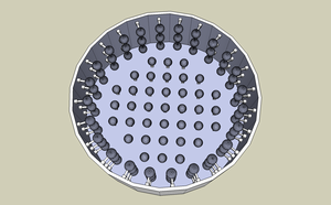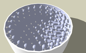 図1のように、洗面器状の容器に水を張り、側壁・底面にたくさんの「流れセンサ」を設置。流れセンサは、流速受容体(ただのボール)とリンク、2軸角度センサからなるモジュール。水流に沿って動くジョイスティックのようなものだと思ってもらえればよい。水をかき混ぜるとn個の流れセンサからそれぞれ2次元の流れベクトル値が出てきて、膨大な入力ベクトル空間が形成される。