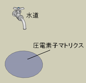図2のように、水道の蛇口真下に圧電素子マトリクスセンサを設置。流れ出てくる水を手で触ると、乱れた水流がセンサにマッピングされる。