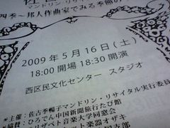 会場はボクらの西区民。の、大ホールではなくスタジオのほう。だいぶ満席に近かったです。何人か広マン関係者の顔ぶれも。有名な演奏家の方々もいらっしゃったようです。
