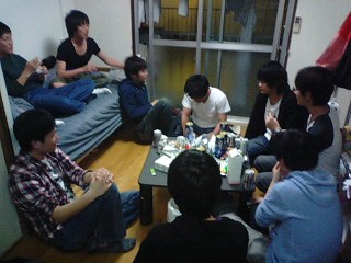 29日、比治山定演終了後。蠅さんを拾って西条まで行きました。18時半過ぎに市大を出て19時半ごろ広大に到着、B4組と合流。ゆめタウンでさらに広大組と合流、買出し&晩飯。蠅さんのラーメンを(ryで、i 田(広大Mc., 3年)家になだれ込む。この時点で総勢10人! エラいことです(図1)。