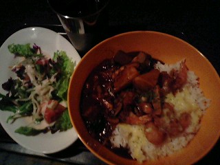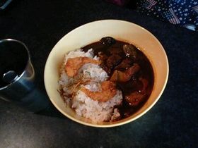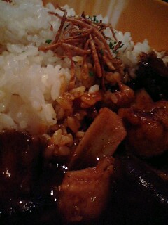 で、夜はカレーを食いにバイトへ。この日のカレーはえび天とビーフ、じゃがいも等のカリーでした(図2)。