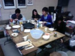 んでその後。マラ太帰還祝賀焼肉パーティ@工大部室が行われやした。メンバはボク、AtoC、マラ太、蠅さん、そしてkみちゃん&cちゃんという異色の顔ぶれ!(図3) 最寄のSparkで材料を買出し、みんなでがんばって野菜を切り、17時半ごろ開始。基本的には肉不足野菜過多でした。最後の方はひたすら野菜。特にナス。もう1週間分ぐらいの野菜を食べた気がします。草食獣かワシは。